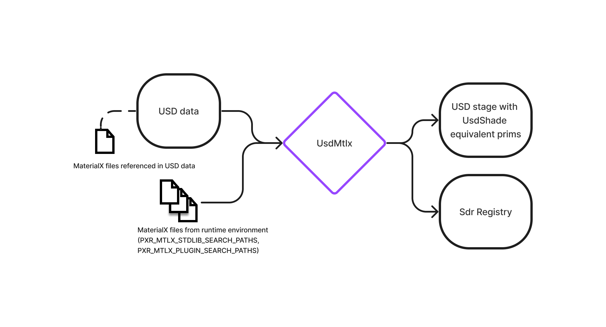 Additionally, when the Sdr registry is initialized, the registry uses two plugins defined in usdMtlx (UsdMtlxDiscoveryPlugin and UsdMtlxParserPlugin) that are used to load .mtlx files and register nodes in the Sdr registry. UsdMtlxDiscoveryPlugin looks for .mtlx files in directories defined in the PXR_MTLX_STDLIB_SEARCH_PATHS environment variable, the PXR_MATERIALX_STDLIB_DIR value set at USD build-time if any, and the PXR_MTLX_PLUGIN_SEARCH_PATHS environment variable, searched in that order.