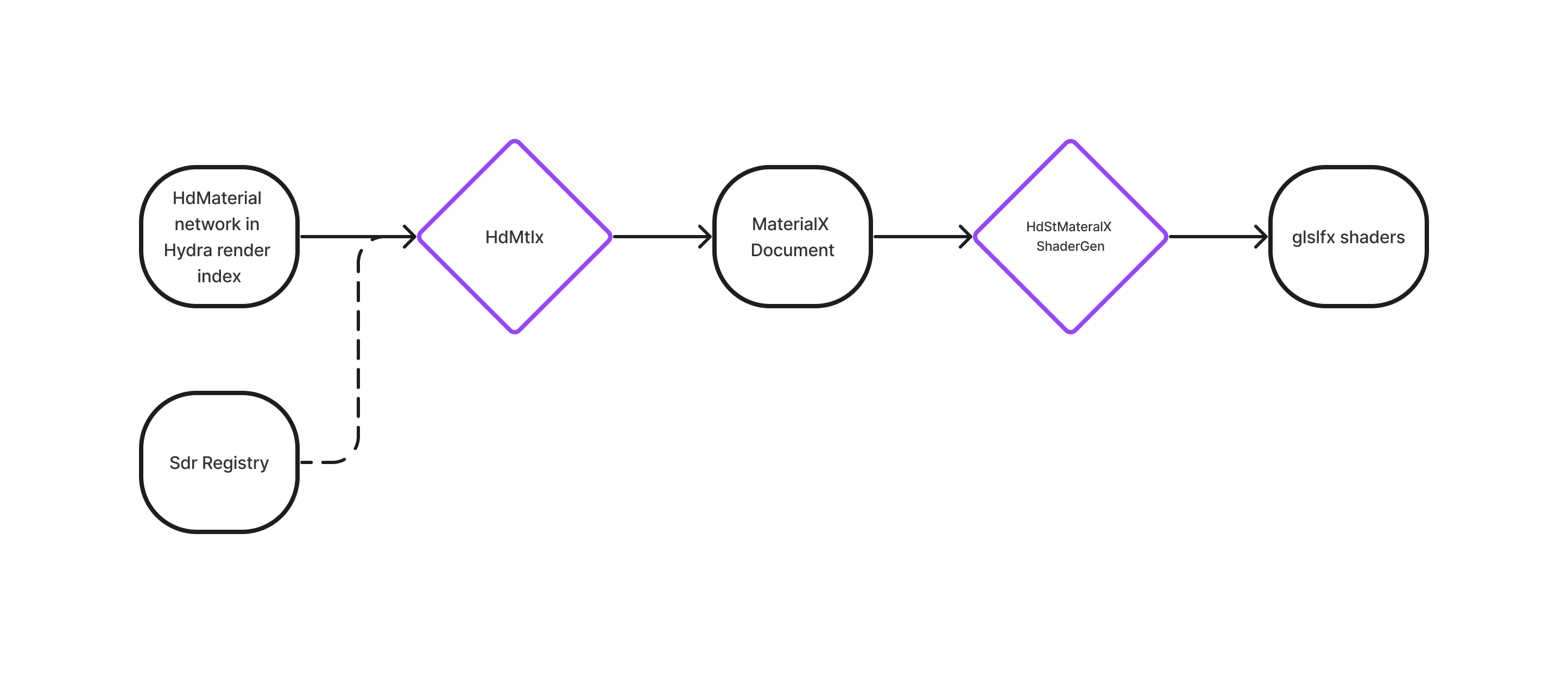 In the diagrams below, any entity in purple uses MaterialX APIs.