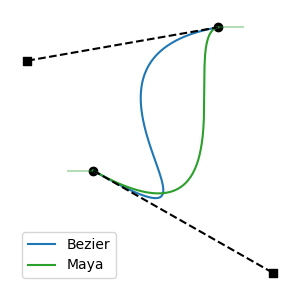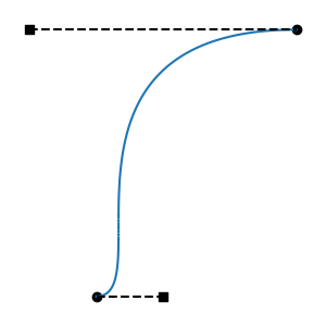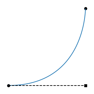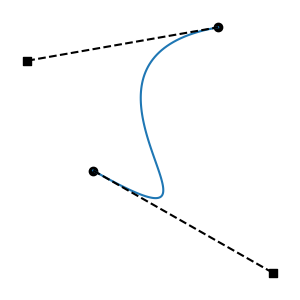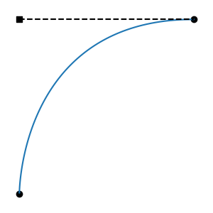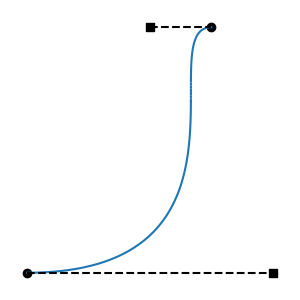 All regressive cases have at least one tangent outside the interval. Is the converse also true: that all cases with a tangent outside the interval are regressive? No: there are non-regressive curve shapes that can only be achieved by placing one of the tangent endpoints outside the interval. This can be non-regressive if the out-of-bounds tangent isn't too long, and the segment's other tangent is short enough. These cases are fairly atypical, involving regions of rapid change, but they are valid functions: