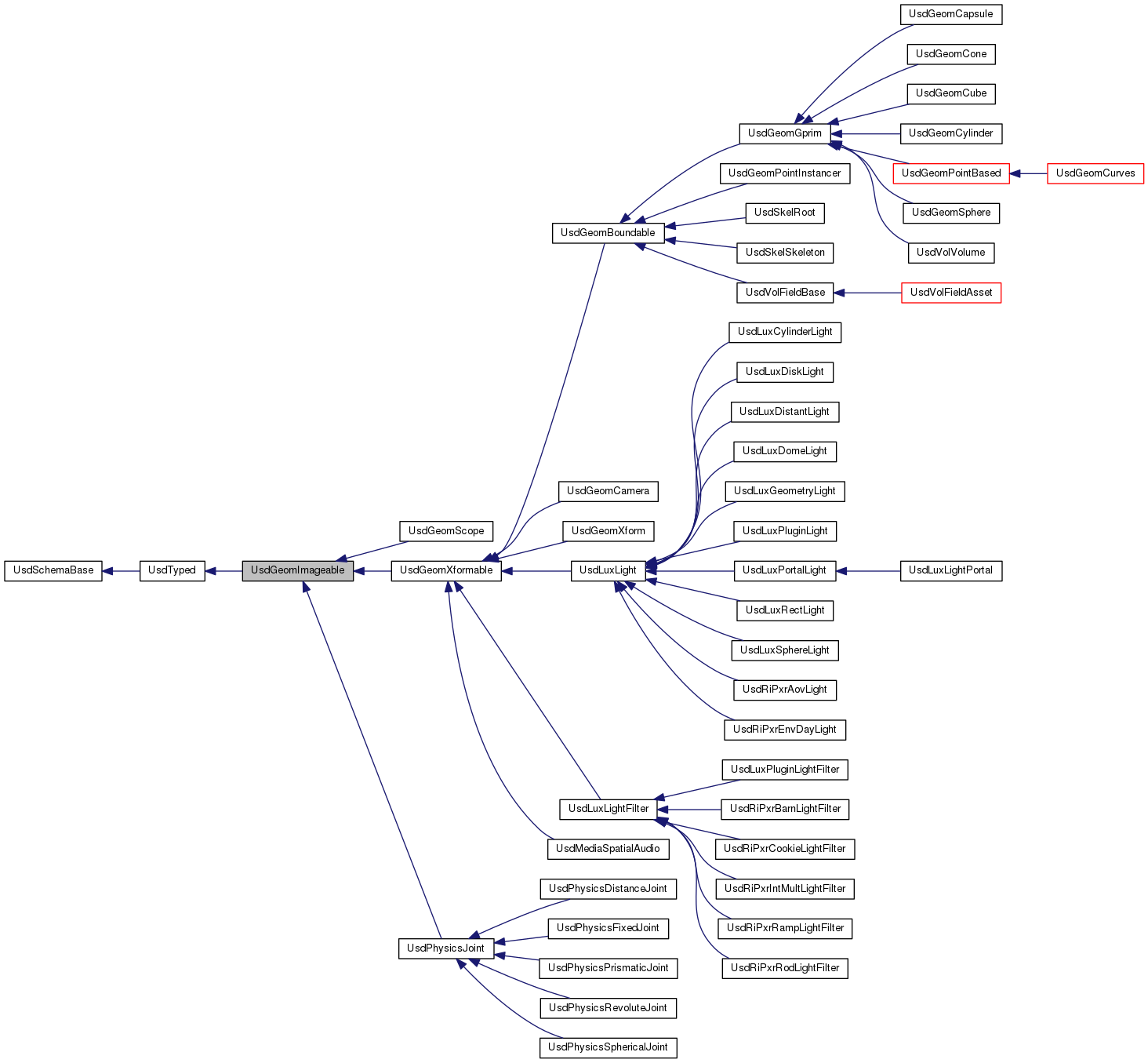 Reimplemented in UsdGeomPointInstancer, UsdGeomXformable, UsdGeomMesh, UsdGeomNurbsPatch, UsdMediaSpatialAudio, UsdLuxDomeLight, UsdGeomNurbsCurves, UsdLuxLightFilter, UsdVolVolume, UsdRiPxrRampLightFilter, UsdRiPxrRodLightFilter, UsdGeomPoints, UsdPhysicsSphericalJoint, UsdRiPxrBarnLightFilter, UsdRiPxrCookieLightFilter, UsdLuxPluginLight, UsdLuxPluginLightFilter, UsdPhysicsPrismaticJoint, UsdPhysicsRevoluteJoint, UsdSkelRoot, UsdSkelSkeleton, UsdVolField3DAsset, UsdVolOpenVDBAsset, UsdLuxLightPortal, UsdPhysicsJoint, UsdLuxRectLight, UsdGeomSphere, UsdLuxCylinderLight, UsdRiPxrIntMultLightFilter, UsdGeomScope, UsdLuxDiskLight, UsdLuxDistantLight, UsdLuxGeometryLight, UsdLuxPortalLight, UsdPhysicsDistanceJoint, UsdLuxSphereLight, UsdPhysicsFixedJoint, UsdRiPxrAovLight, UsdRiPxrEnvDayLight, UsdGeomXform, UsdLuxLight, UsdVolFieldAsset, UsdGeomPointBased, and UsdVolFieldBase.