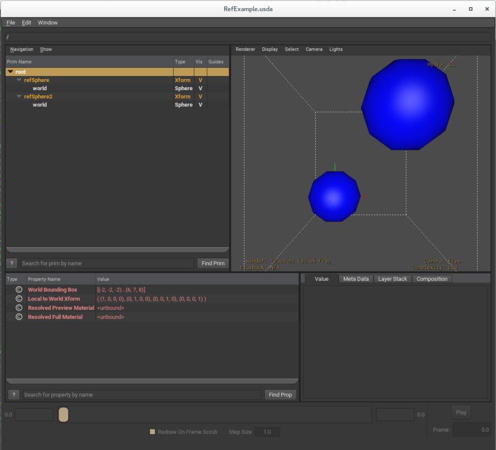 If it were unselected in the namespace browser, usdview would show /refSphere in orange to indicate that it is a referencing point on our stage. Our screenshot shows refSphere’s row selected, however, to show both what our overridden transformation looks like as attributes, and to note in the Meta Data inspector that the reference and its target are listed. Note also that there is no prim named “hello” since it has been referenced into /refSphere.
