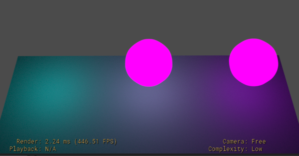 The following example applies MeshLightAPI to a complex surface to act as a light for 4 spheres. The Mesh sits “below” the spheres.